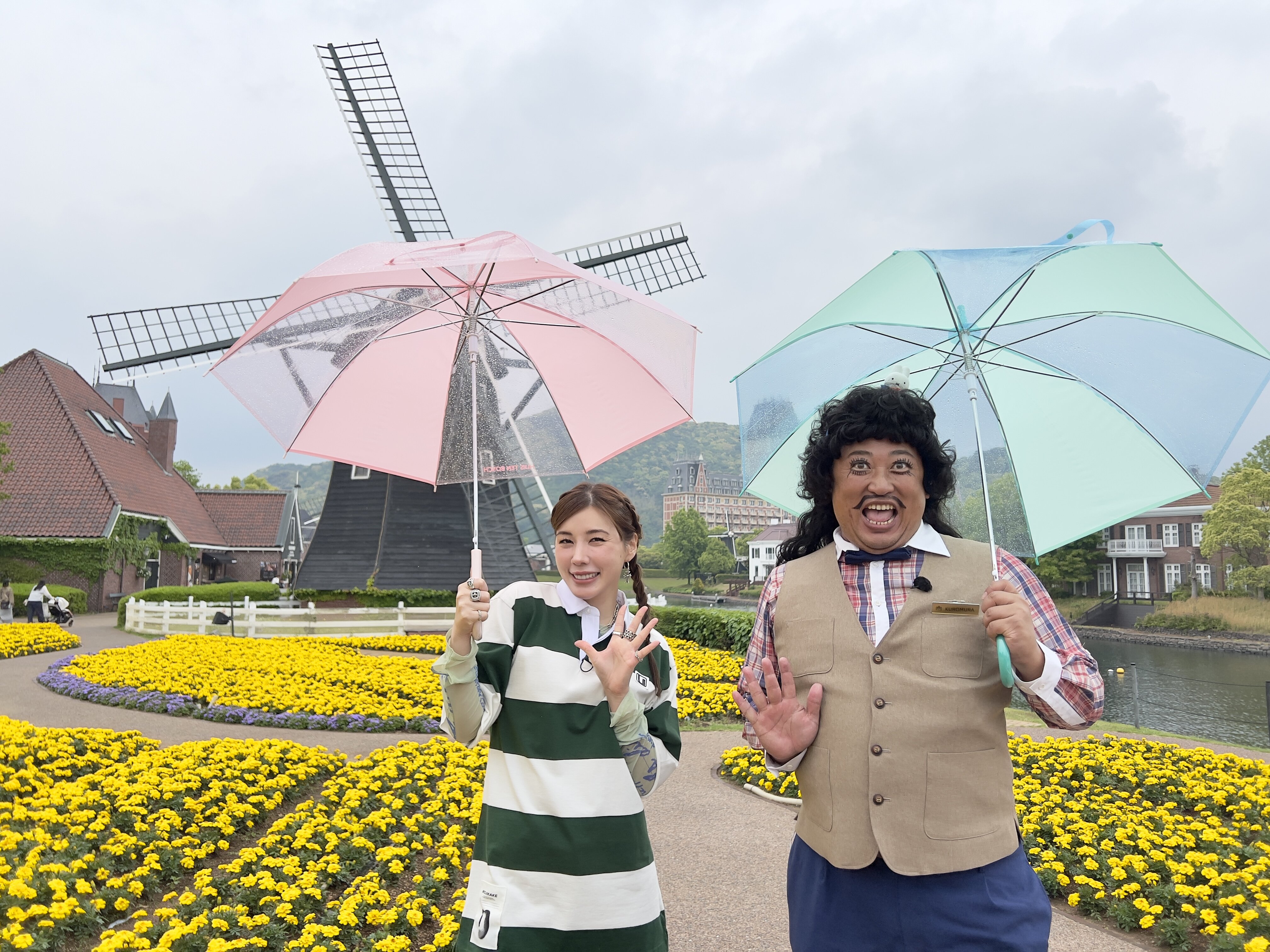 シンボルの風車の前で番組がスタートし、3階建てのメリーゴーラウンドに大はしゃぎ!