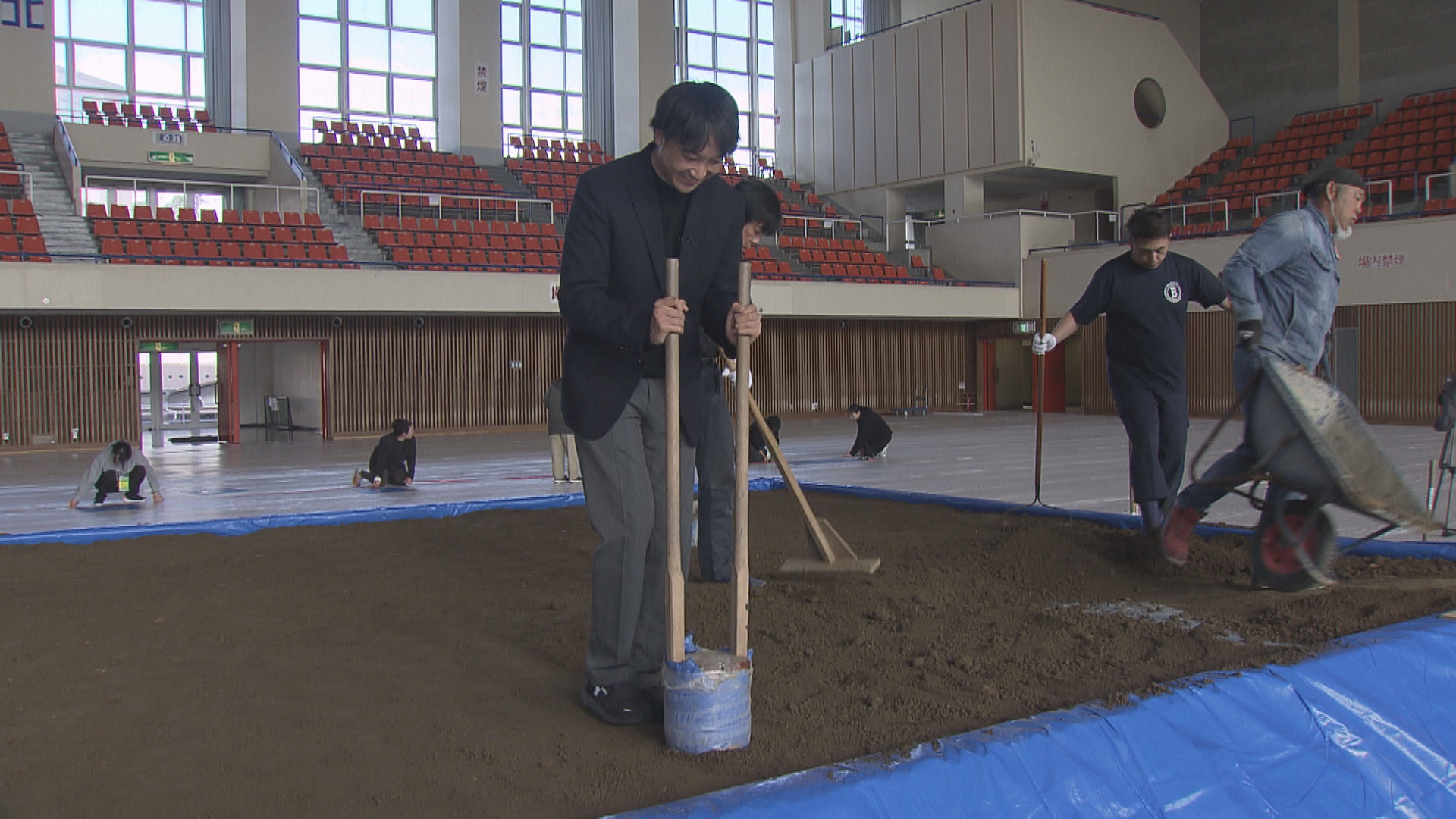 山口史泰です。佐世保にきておよそ1か月。先日特別な体験をしてきました。それが・・・土俵づくりです。佐世保では2年ぶりに大相撲の巡業が行われ横綱の豊昇龍や新大関の安青錦、平戸市出身の平戸海などの力士が集まりました。土俵づくりは巡業の前日に行われます。本場所と同じ埼玉から取り寄せた土6.7トンを木枠に敷き詰めて、私が持っている「子タコ」と呼ばれる道具で固めていきます。土俵づくりでは力士が踏ん張ってもケガをしないようにとにかく固く固めることがポイントです。叩いて...叩いて...叩いて...の繰り返し、子タコは10キロほどの重さだと思われますが、ずっと動かし続けると腕に疲労がきました。