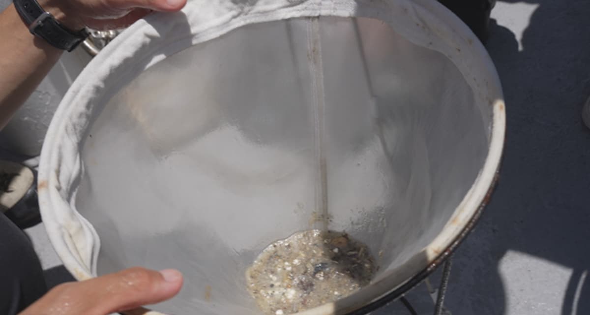 - 海表面を曳くことができるニューストンネットを用い、曳網速度2ノット、曳網時間は20分としました。