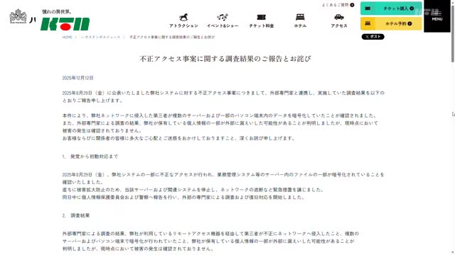 ハウステンボスに不正アクセス… 154万人分の個人情報漏洩か 来場者や職員、取引先など 悪用被害なし