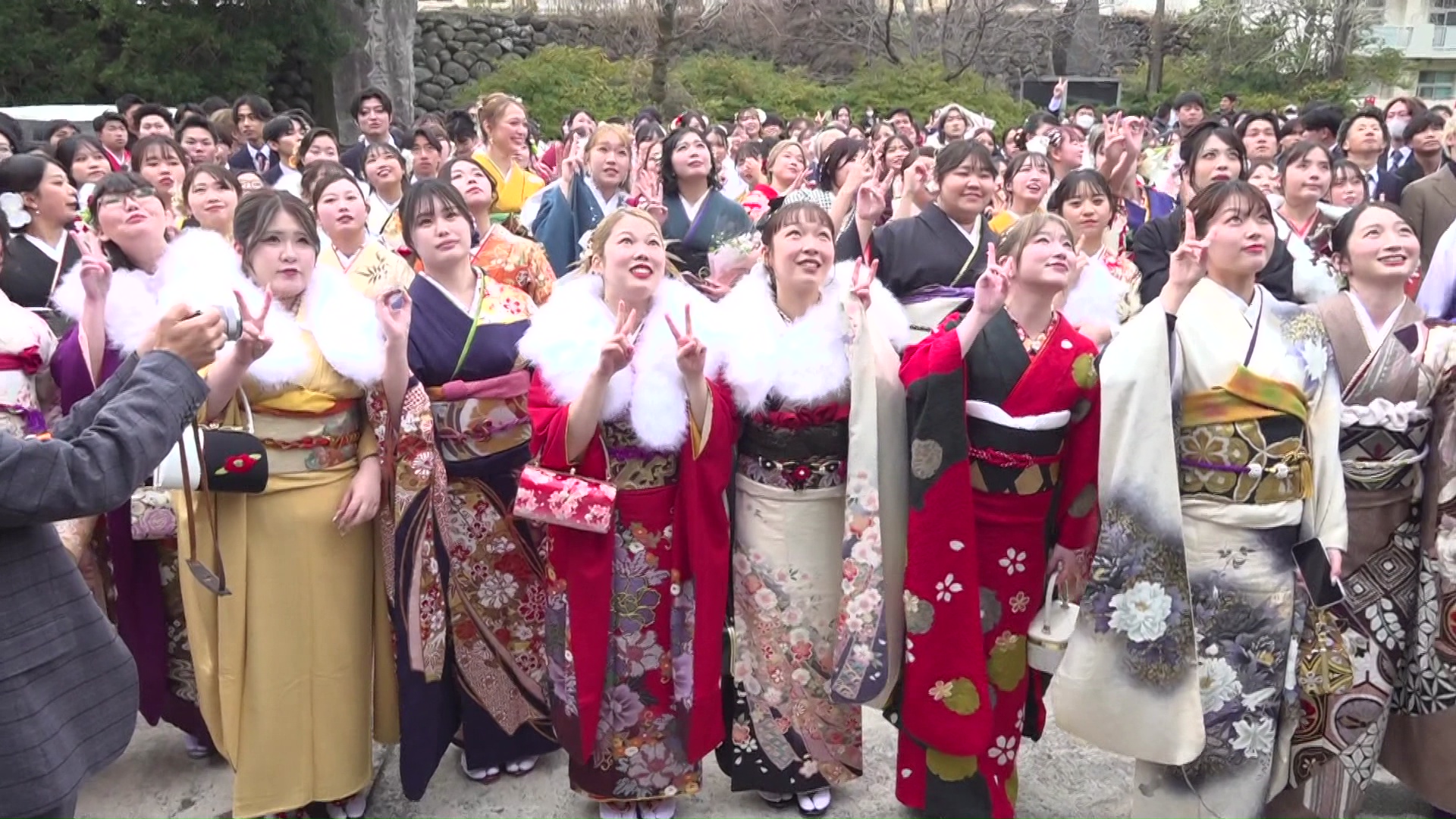 五島市の福江文化会館に集まった晴れ着に身を包んだ若者たち。
