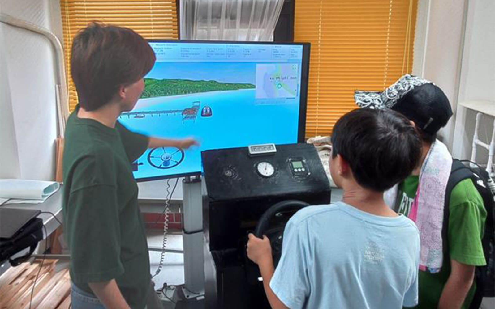 モニターに映る船を操作して、いざ大海原へ!船の舵取りって意外と難しい!?滅多にないチャンス、ぜひ体験してみてね!